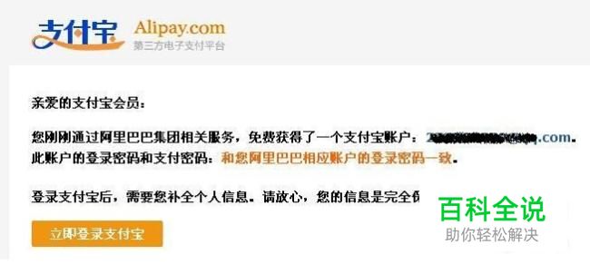 完成淘宝账号注册后,你会收到一封来自支付宝的邮件,提示大家获得一个免费的支付宝账户,但是登录支付宝后,需要完善、补全个人信息