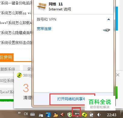 首先在电脑右下角的类似电脑屏幕的图标,点开后可以看到一个“打开网络和共享中心”的文字链,点击进入。