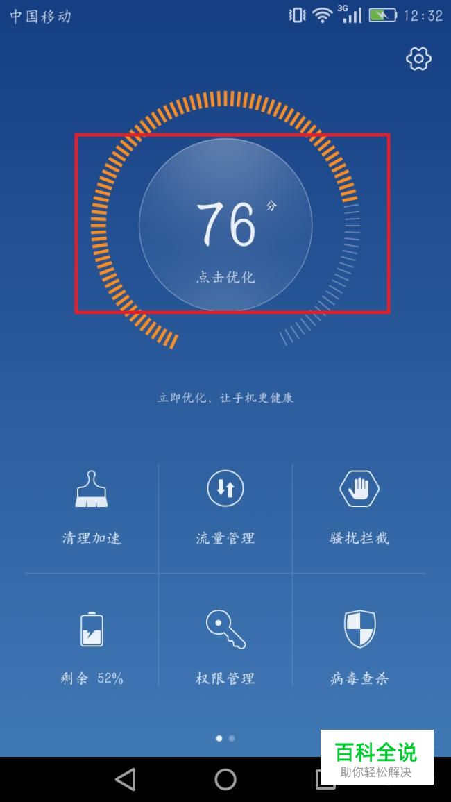 进入手机管家后,会自动扫描手机,扫描完成后点下优化手机即可。