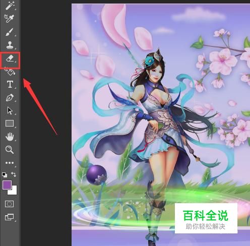 在工具箱内找到橡皮工具,使用橡皮工具将人物后的光线擦除,如图所示: