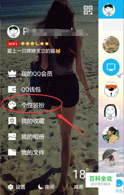 首先,登录我们的QQ后将页面右滑,这时可以看到左侧的一列选项中有“个性装扮”,点进去。