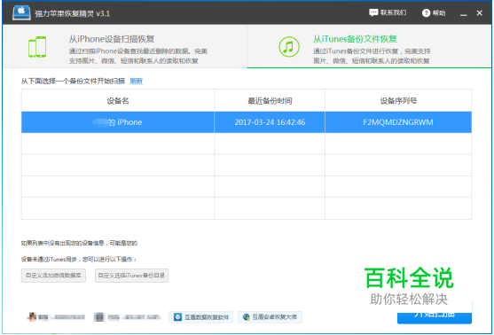 首先先下载好软件,接着再运行强力苹果恢复精灵,软件会自动检测到连接在电脑上的苹果手机,我们可以通过软件界面看到显示的苹果手机的相关信息,点击选择“从iTunes备份文件恢复”,然后点击“开始扫描”按钮