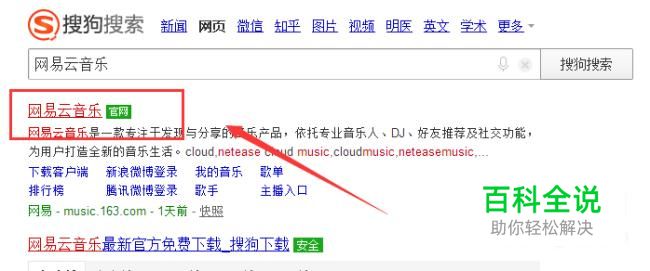 打开浏览器,在搜狗搜索框内输入“网易云音乐”进行搜索,没有下载播放器的可以进入官网使用在线听歌,不过建议还是下载一个客户端,这样比较方便。