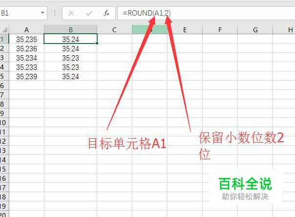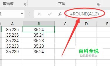 例如A1为目标单元格值为35.235,想要四舍五入后保留两位小数,就需要在B2单元格中输入:=round(a1,2)然后回车,就得到我们需要的值35.24