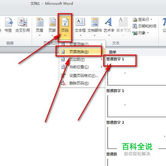 如图,点击“页码”下的“页面底端”旁边的“普通数字1”。