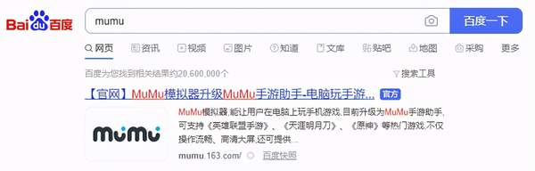 第一步:百度搜索”mumu“,找准MuMu手游助手官网进入下载;