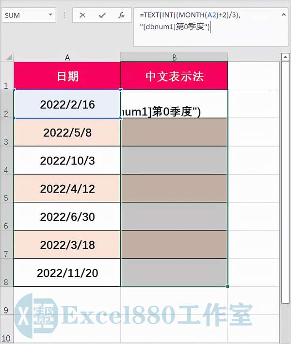 2、在编辑栏中,输入公式:=TEXT(INT((MONTH(A2) 2)/3),"[dbnum1]第0季度"),如下图所示。