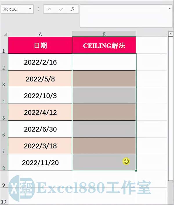 3、按【Ctrl Enter】组合键确认,即可应用CEILING函数公式计算日期,效果如下图所示。