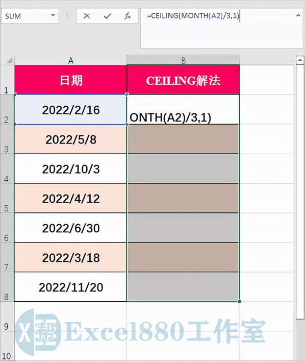 2、在编辑栏中,输入公式:=CEILING(MONTH(A2)/3,1),如下图所示。