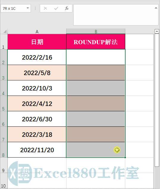 3、按【Ctrl Enter】组合键确认,即可应用ROUNDUP函数公式计算日期,效果如下图所示。