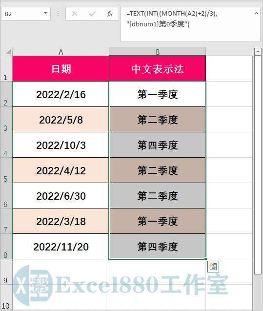 如下图所示,在工作表中快速将日期换算为对应季度的4种方法,你都会吗?