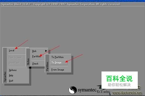 进入了GHOST11介面后,可以看到有[local本地],[options选项],[help帮助]和[quit退出]选择。 我们选择[local]-[partition]-[to image]来备份系统。 (注:如果你选择[local]-[disk]-[to disk]是选择整个硬盘的意思,是硬盘对硬盘对拷。这个在装多台电脑时很有用。) (注:如果你选择[local]-[partition]-[from image]是用镜像还原系统的意思。下一章会讲到) (注:如果你选择[local]-[partition]-[to partition]是指分区对分区的对拷,比较少用到)。
