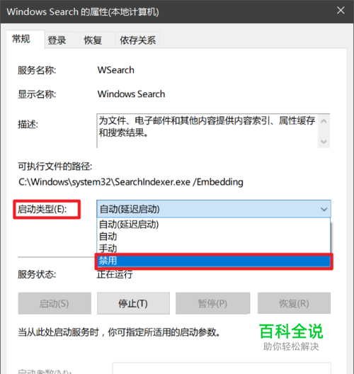弹出“Windows Search的属性”后展开“启动类型”项目,选择“禁用”。