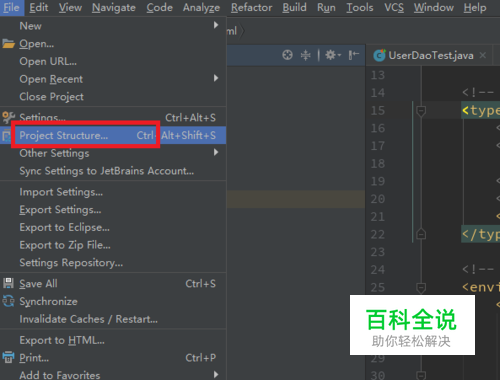 打开项目,选择“file->project structure”,或者使用快捷键Ctrl+Alt+Shift+S。
