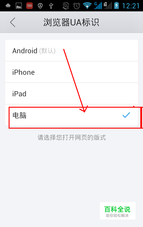 回到设置项看到浏览器UA标识处显示设置为电脑,即为设置成功。此时在浏览的网页就是网页版显示了。