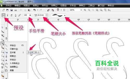 CorelDRAW 软件 艺术笔工具就像毛笔一样(很多样式的) 随着鼠标的移动 进行随意地涂鸦(有点像毛笔画) 预设 里的一些功能及参数 如图