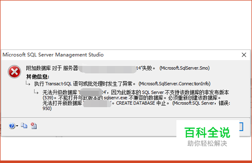 将SQL2000的数据库文件,附加到SQL2104上面,提示失败,点击消息查看,在其他信息中记录:无法升级数据库,因为此版本的SQL Server不支持该数据库的非发布版(539)。不能打开与此版本的sqlservr.exe不兼容的数据库。必须重新创建数据库。无法打开信数据库。Create Database终止。(错误:950)