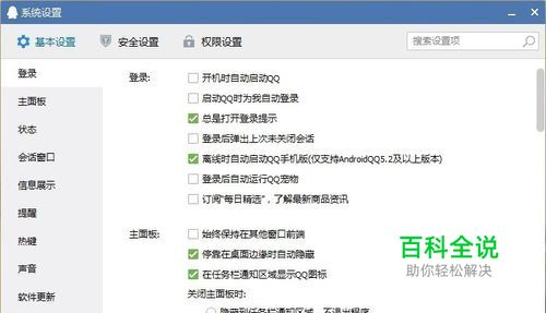 打开“系统设置”界面后,可以看到这里有很多关于QQ的基本设置。现在页面中显示的是关于QQ登录的基本设置。