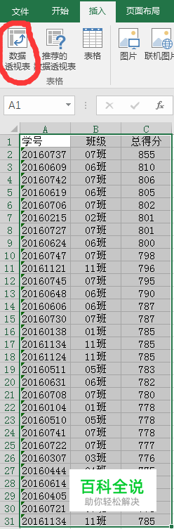 首先,选中整个表格,点击“插入”里面的“数据透视表”(图中红色圈起来的)
