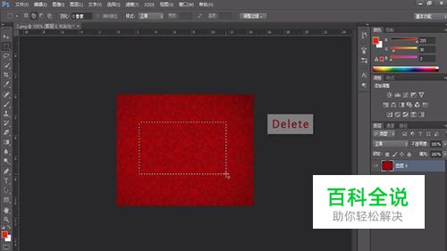 首先我们选择左边的矩形选框工具,将鼠标移动到图中,按住鼠标左键,拖动鼠标,建立一个矩形选区,然后敲击Delect键来删除选区。这个时候我们发现选去红色不见了,显示的是背景色。