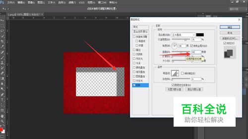 弹出图层样式对话框,我们在左边样式中选择投影切换到投影面板,我们可以更改其中的选项,达到不同的投影效果。例如我们在距离中直接输入50我们发现图层中背景色的选区有大约2/3的面积变成了灰色的阴影。