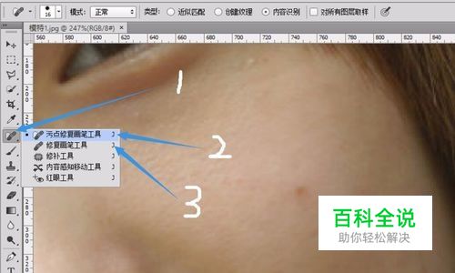 左键长按“污点修复画笔工具”,或者直接点击右键也可以,弹出工具组选项。这里的2和3的工具都可以祛痘。