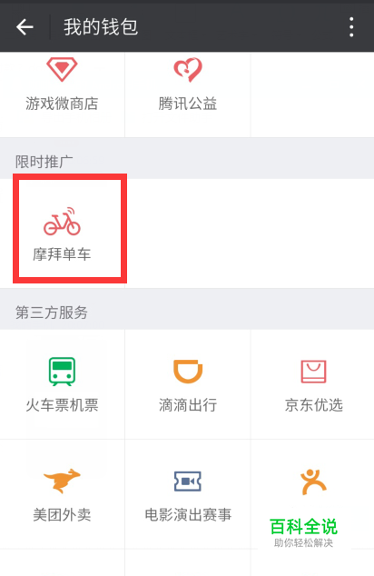 打开了微信的【钱包】之后,在里面可以看到这个【摩拜单车】的选项