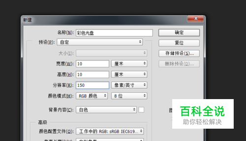 打开ps,新建一个10x10cm,分辨率为150的文件,如图所示: