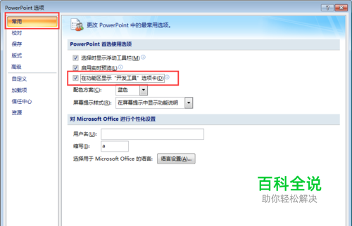 选择左侧的“常用”选项,然后在右侧区域勾选“在功能区显示“开发工具”选项卡”。