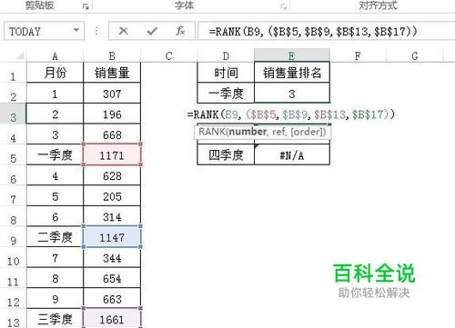 但是填充后都是错误的结果,原因是这样的,rank函数中的第一个参数,上面是B5,在往下填充过程中,就变成B6了,但是后面的由于是绝对引用,不受影响,因此,我们只需要将B6改为B9,B7改为B13,B8改为B17就行了。