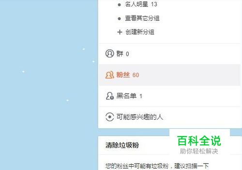 这时候我们道电脑“粉丝”页面查看,我们看到左边菜单栏下面会告诉你扫描出来的结果,这时候我们单机“清理垃圾粉”,就把垃圾粉给清除了,垃圾粉不定时的自动关注你,所以要定期清理。