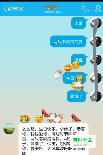 关键的地方是输入关键字,手机QQ只支持一部分关键字才会掉表情下来。比如输入“生日快乐”“么么哒”“恭喜”“清明时节雨纷纷”我也爱你,两只老虎跑得快,早生贵子,屌爆了,保重,想你想你想你,爱安哥,大风车吱呀吱悠悠的转;我现在大概也只知道这么多关键字。看效果出来了。你也可以一个个关键字输入,每个关键字的表情都不一样哦!