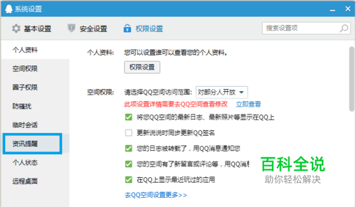 在系统设置界面点击“权限设置”子选单进入权限设置界面,再点击左侧“资讯提醒”