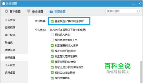 可以看到“登陆后显示“腾讯网迷你版””,默认是勾选的,我们把勾去掉,退出设置界面。