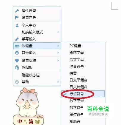 首先,切换到该输入法,在软键盘内选择 标点符号。(笔者的输入法是 右击输入法>>鼠标移动到主菜单内的 软键盘>>点击子菜单中的 标点符号)