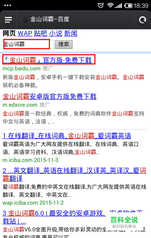 首先,我们还是打开浏览器,在搜索栏中输入金山词霸,然后点击搜索。出现下图界面,然后点击第一个金山词霸。