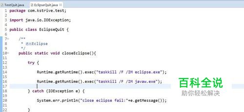 打开eclipse,新建一个项目,并新建一个类:EclipseQuit.java,并编写代码, 如下,如图: package com.kstrive.test; import java.io.IOException; public class EclipseQuit { /** * 退出Eclipse */ public static void closeEclipse(){ try { Runtime.getRuntime().exec("taskkill /F /IM eclipse.exe"); Runtime.getRuntime().exec("taskkill /F /IM javaw.exe"); } catch (IOException e) { System.err.println("close eclipse fail:"+e.getMessage()); } } }