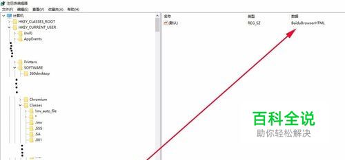 在【注册表】编辑页面的左侧导航窗口,找出:HKEY_CURRENT_USER\Software\Classes\.html