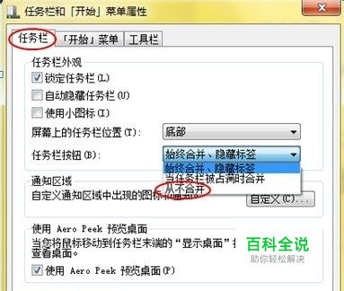 在属性面板内选择“任务栏”,在下面选择“从不合并”,如图;
