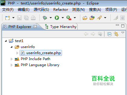 使用EclipsePHP Studio 3 创建一个PHP工程名称为test1,在工程名下面userinfo的文件夹,然后在文件夹创建一个PHP文件(userinfo_create.php):