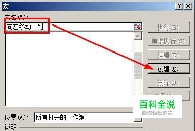 打开了宏对话框,我们填写宏名为【向左移动一列】,然后点击【创建】按钮。