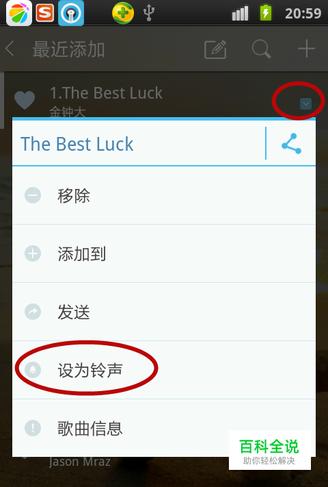 选择一首歌,点击歌名旁边的箭头,在下拉菜单中点击“设为铃声”