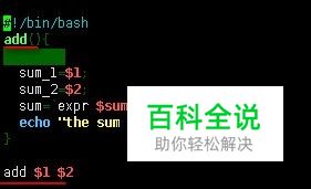 shell脚本的内容如下: #!/bin/bash add(){ sum_1=$1; sum_2=$2; sum=`expr $sum_1 + $sum_2`; echo "the sum is ${sum}"; } add $1 $2