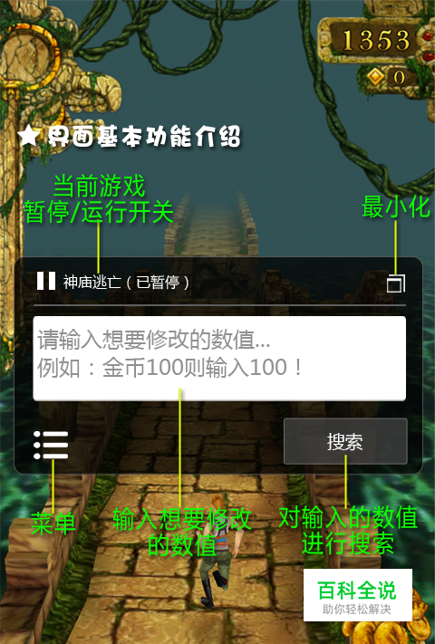 1. 点击修改器浮标切换到修改器界面,在输入框中输入你想修改的游戏属性值(金币/血量/得分/力量…)的当前值;