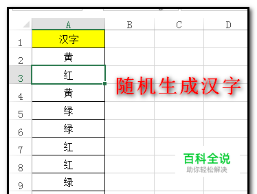 假设,在A列中随机生成“红黄绿”这三个字的任意一个字。 那么,我们可以利用函数:MID和RANDBETWEEN