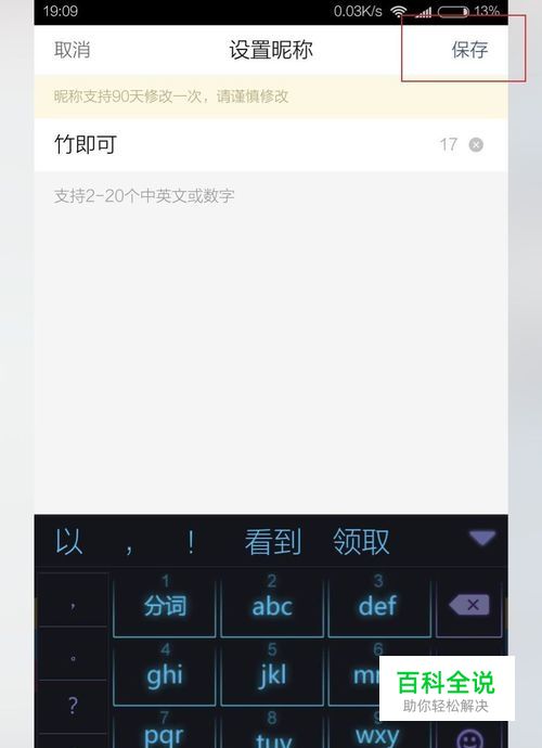 输入新的昵称并点击保存。要注意的是90天才可以修改一次。