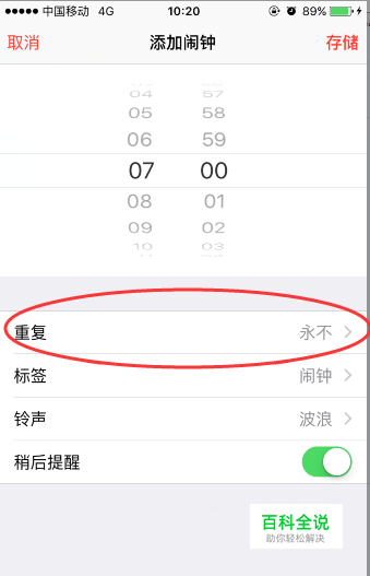 回到“添加闹钟”页面后,我们就可以看到“重复”选项由原来的“永不”变成了“工作日”。然后点击右上角的“存储”按钮,就可以完成新闹钟的设置。