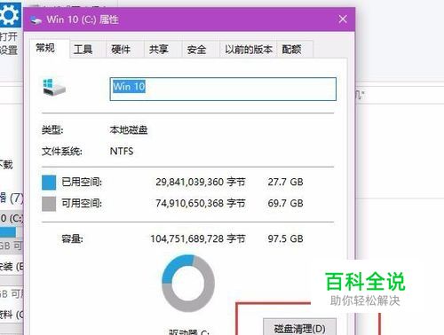 打开Win10系统磁盘属性页面之后,在磁盘属性页面中点击选择“ 磁盘清理”选项,打开Win10系统磁盘清理向导页面。