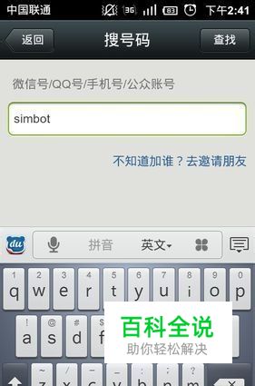 登录微信后选择“按号码查找”,您可通过以下方式添加好友,输入simbot,如下图所示: