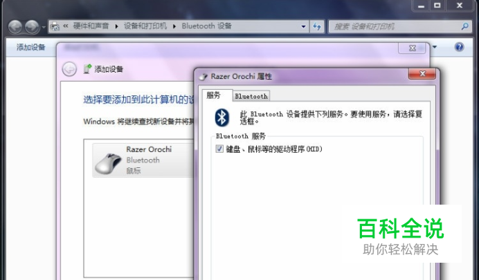 搜索到蓝牙鼠标后先不点下一步 - 右键点击该设备 - 选择属性 - 勾选Bluetooth服务中的“键盘、鼠标等得驱动程序”选项(如图)